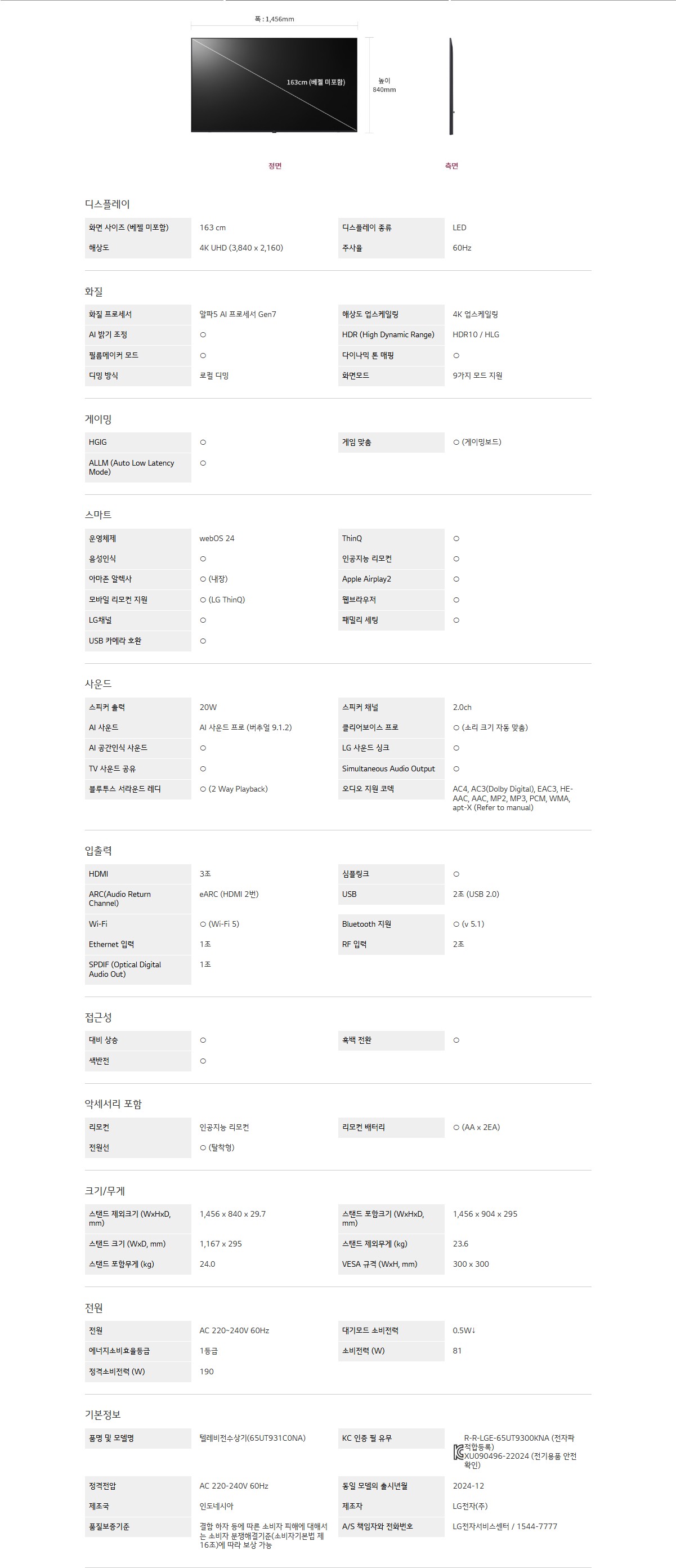 화면 사이즈 (베젤 미포함) : 163 cm