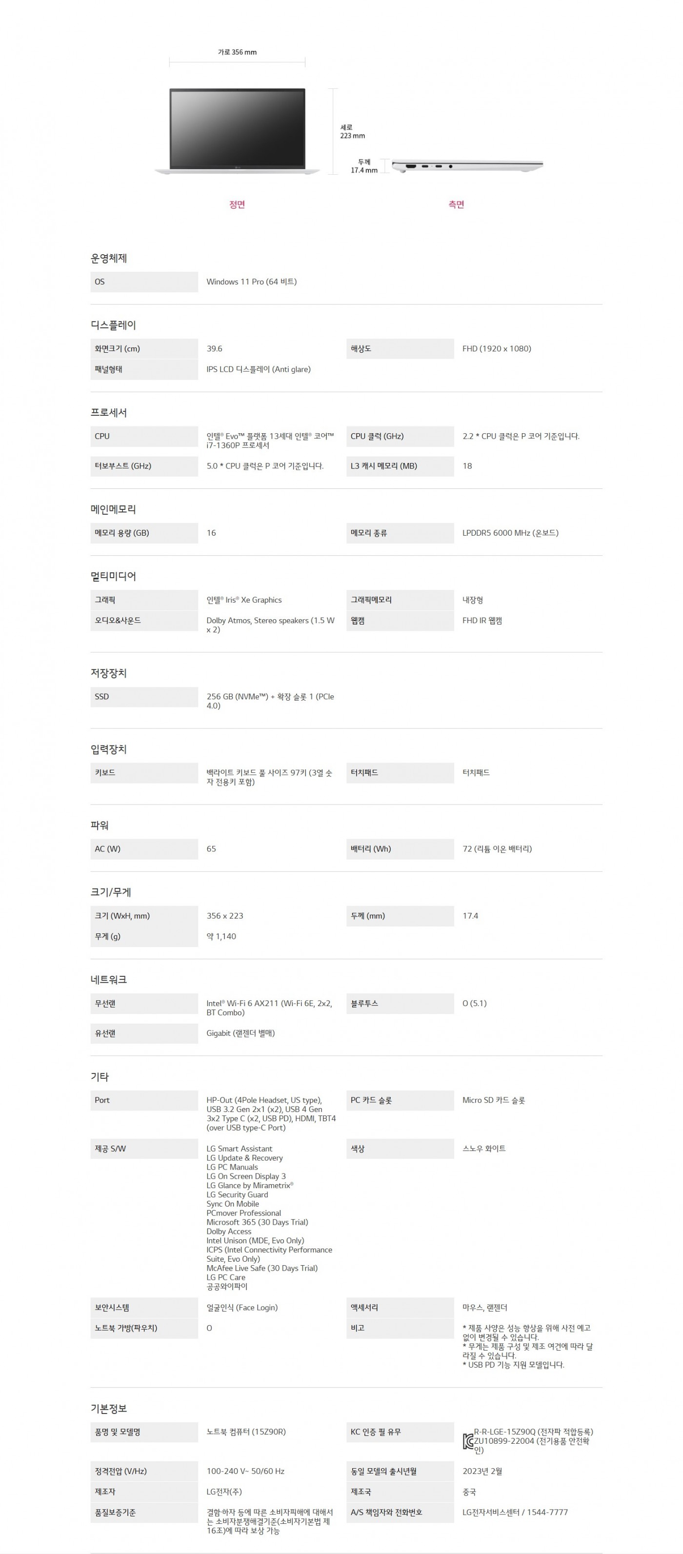 OS:WINDOWS 11 PRO (64 비트) CPU:인텔® EVO™ 플랫폼 13세대 인텔® 코어™ I5-1340P 프로세서 SSD:256 GB (NVME™) + 확장 슬롯
