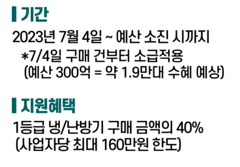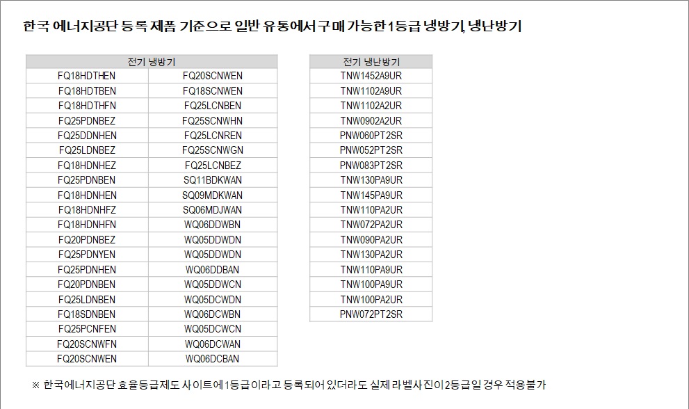 한국전력 에너지마켓플레이스→에너지효율화→에너지효율향상 사업 홈페이지에 팝업창, 신청 tab 생성 예정(7월중) (URL: https://en-ter.co.kr/main.do#first) ① 대상 : 중소벤처24(https://www.smes.go.kr)에서 중소기업(소상공인) 확인서 발급 가능한 소상공인 ② 2015년까지 생산된 제품을 에너지 소비효율 1등급 제품으로 교체 시 지원 ※ 기존 제품의 제조명판 / 설치 사진 등 필요 (추후 세부기준 확정 시 추가 증빙이 요구 될 수 있음) ③ 중소벤처24에서 발급한 소상공인 증빙서류에 기재된 주소에 구매한 제품 설치 ④ 신규 설치한 제품의 제조명판 사진, 에너지 소비효율 등급 라벨 사진, 구매 영수증을 증빙으로 첨부하여 개별 신청 1등급 냉/난방기 구매 금액의 40% (사업자당 최대 160만원 한도) 한국 에너지 공단 – 효율등급제도에서 ‘전기냉방기’, ‘전기냉난방기’ 에 등록된 1등급 모델에 한함 문의주시면 상세안내 드리겠습니다. T.064-747-1784 (베스트프라자) |