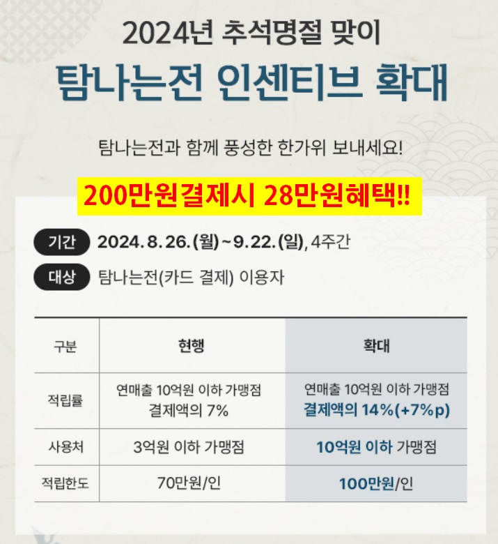 | 탐나는전 추석맞이 최대14%적립혜택 2024.08.26 |