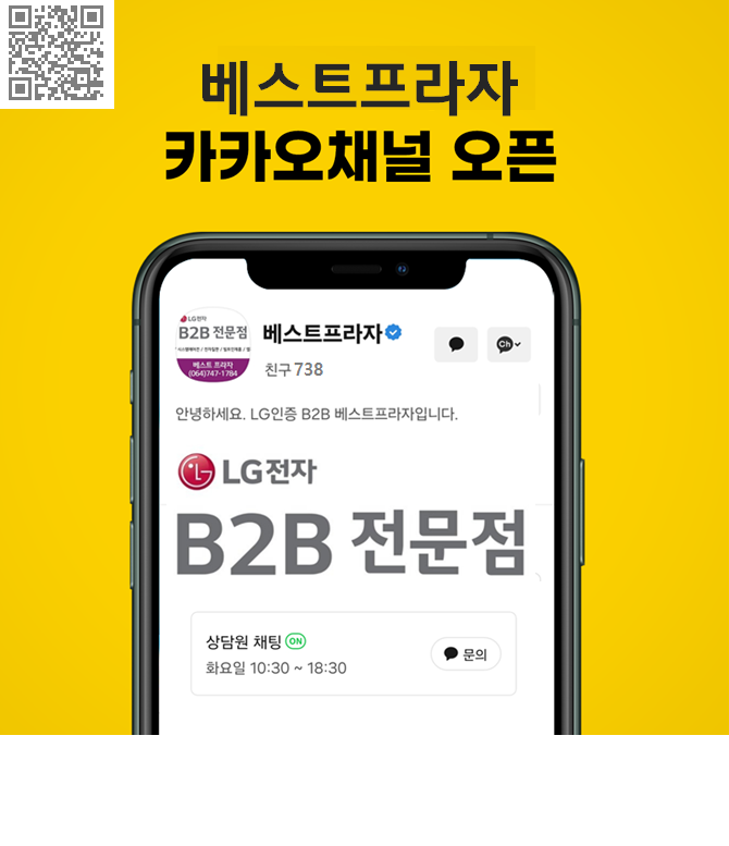 안녕하세요, 베스트프라자입니다! 베스트프라자에서 카카오채널을 오픈했습니다! 이제 실시간 상담을 통해, 제품 문의와 견적 등 더 나은 서비스로 찾아뵙겠습니다. 더불어, 다양한 이벤트 소식도 받아보시길 바랍니다. 실시간 채팅 상담은 평일 오전 10:30부터 18시까지 운영됩니다. 아래 링크를 통해 "베스트프라자" 카카오채널을 추가하시고 여러가지 정보와 혜택을 받으세요! 많은 이용 부탁드립니다. 감사합니다! 위 링크를 클릭시 "베스트프라자" 친구추가로 바로 이동됩니다.