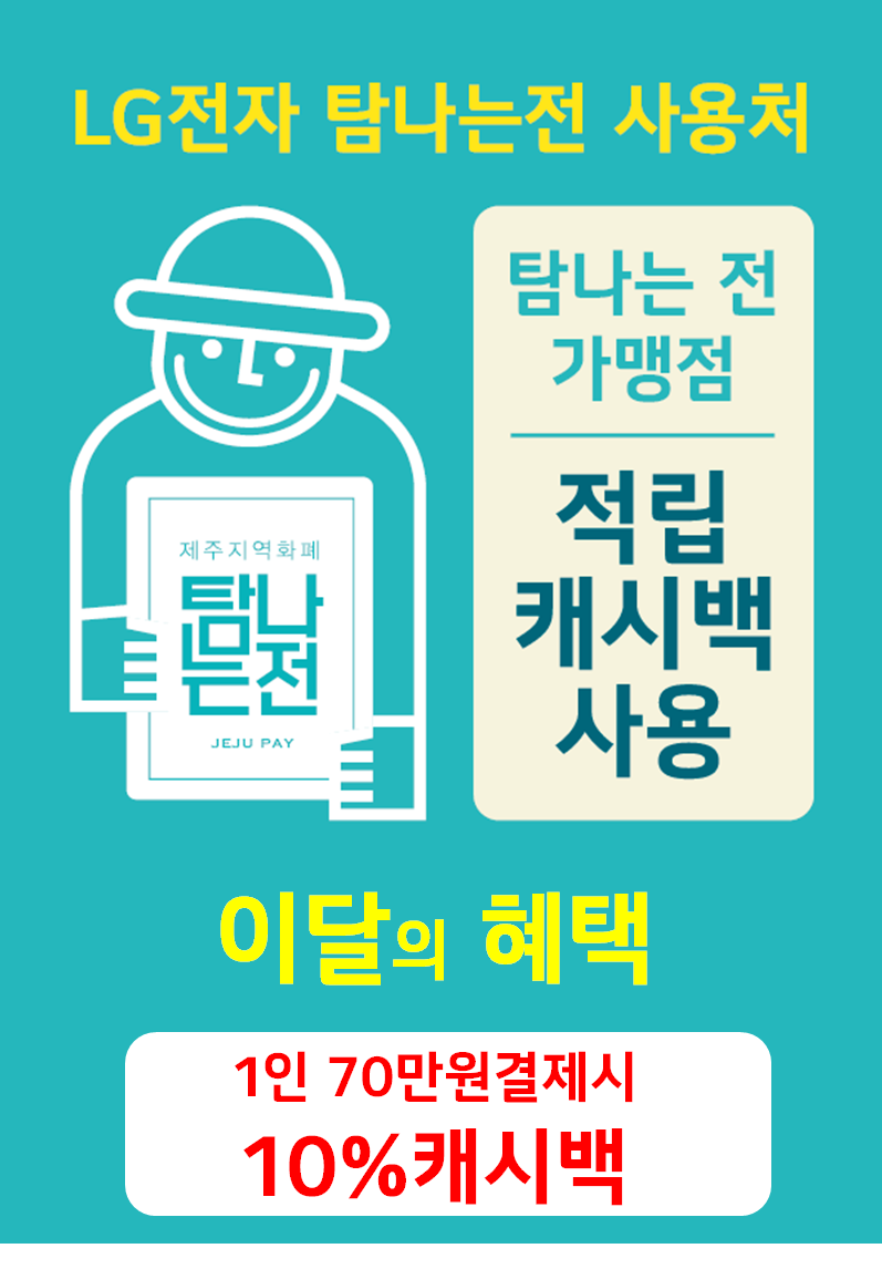 ![]() LG전자B2B전문점 베스트프라자는 제주지역화폐 탐나는전 사용가능매장입니다. ※대형마트,대형가전매장,온라인매장등은 사용불가 매월 1인당 70만원한도충전가능하며 결제시 7% 적립(캐시백)됩니다. 예) 50만원 TV결제시 7%(35,000원) 적립 70만원 세탁기결제시 7%(49,000원) 적립 100만원 냉장고결제시 7%(사용한도 70만원의7% 49,000원적립) 적립된 캐시백은 자점(베스트프라자)에서사용가능하며 연매출 10억이하 가맹점(식당,옷가게,슈퍼,세탁소 등)에서 현금처럼 사용가능합니다. 사용처 : LG베스트프라자 구좌점 T.064-784-1784 LG베스트프라자 외도점 T.064-747-1784 현금처럼 사용가능합니다. 탐나는전사용문의: 1600-3971 제품구입문의:064-747-1784 |